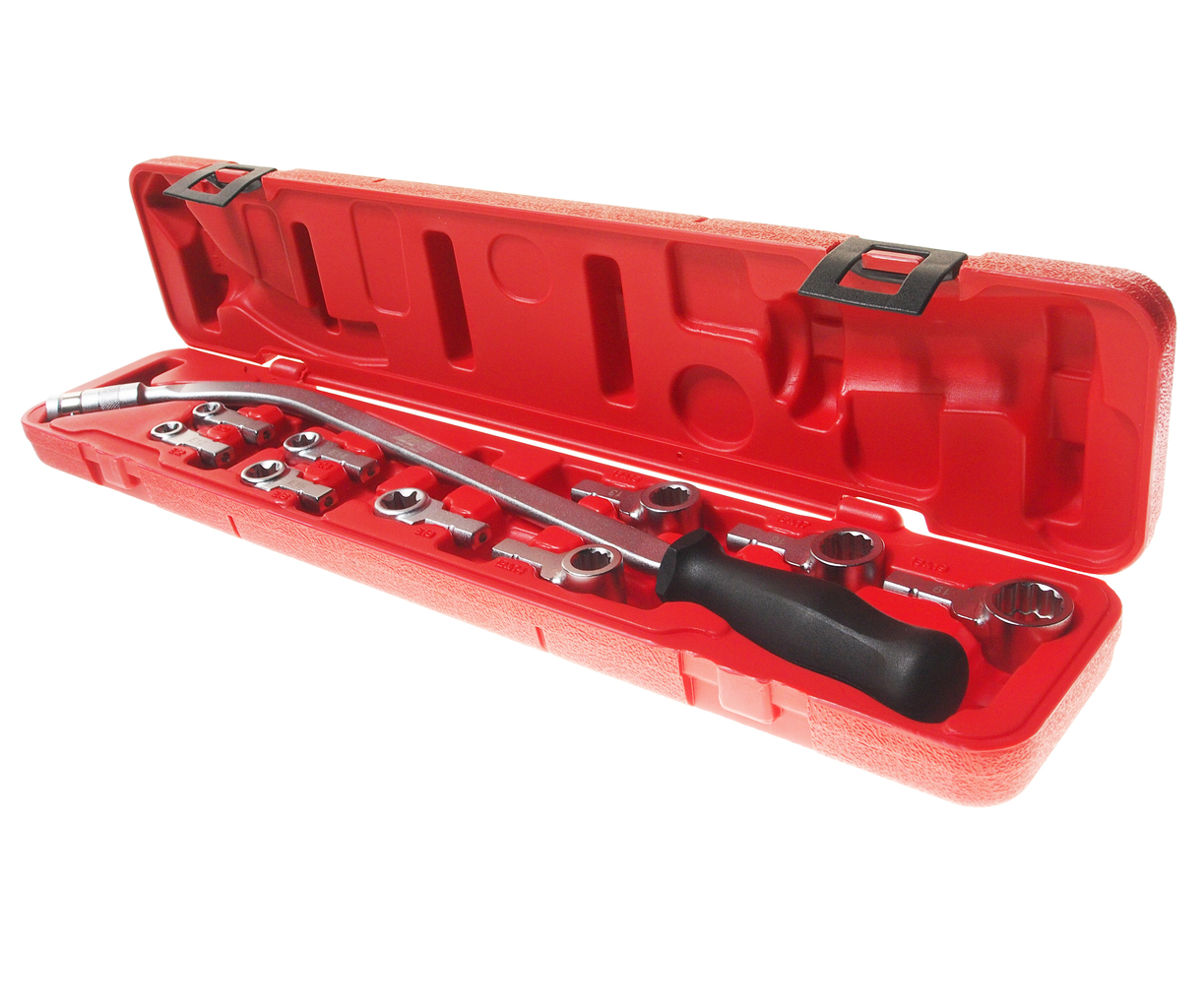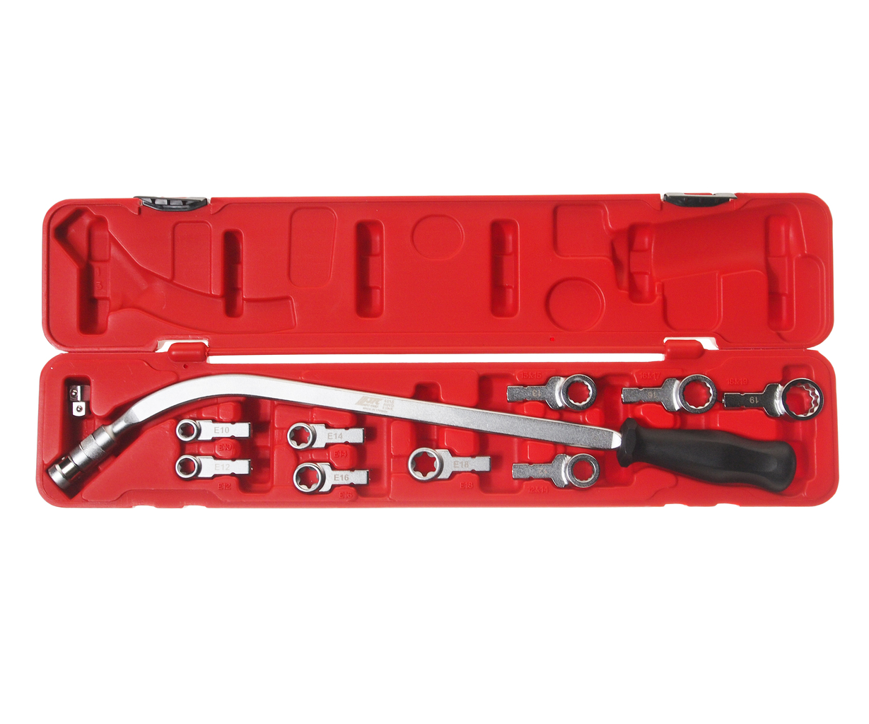 Набір універсальний у використанні завдяки 13 адаптерам, що входять до комплекту. Спеціально розроблено для використання в обмеженому просторі. Адаптери: двосторонні 12, 13, 14, 15, 16, 17, 18, 19 мм; односторонні Е10, Е12, Е14, Е16, Е18. ;