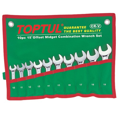 Набір ключів комбінованих вкорочених TOPTUL 10 шт. 10-19 мм GAAA1002 в зеленому чохлі: AAAF1010 - Ключ комбінований укорочений 10мм (полірований) | AAAF1111 - Ключ комбінований укорочений 11мм (полірований) | AAAF1212 - Ключ комбінований укорочений 12мм (полірований) | AAAF1313 - Ключ комбінований укорочений 13мм (полірований) | AAAF1414 - Ключ комбінований укорочений 14мм (полірований) | AAAF1515 - Ключ комбінований укорочений 15мм (полірований) | AAAF1616 - Ключ комбінований укорочений 16мм (полірований) | AAAF1717 - Ключ комбінований укорочений 17мм (полірований) | AAAF1818 - Ключ комбінований укорочений 18мм (полірований) | AAAF1919 - Ключ комбінований укорочений 19мм (полірований)