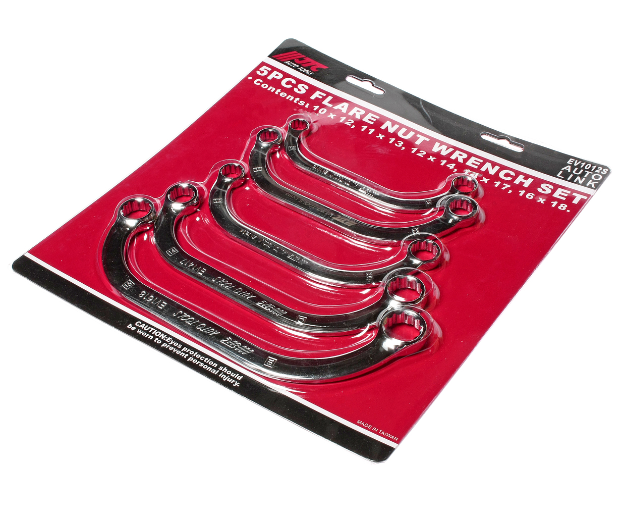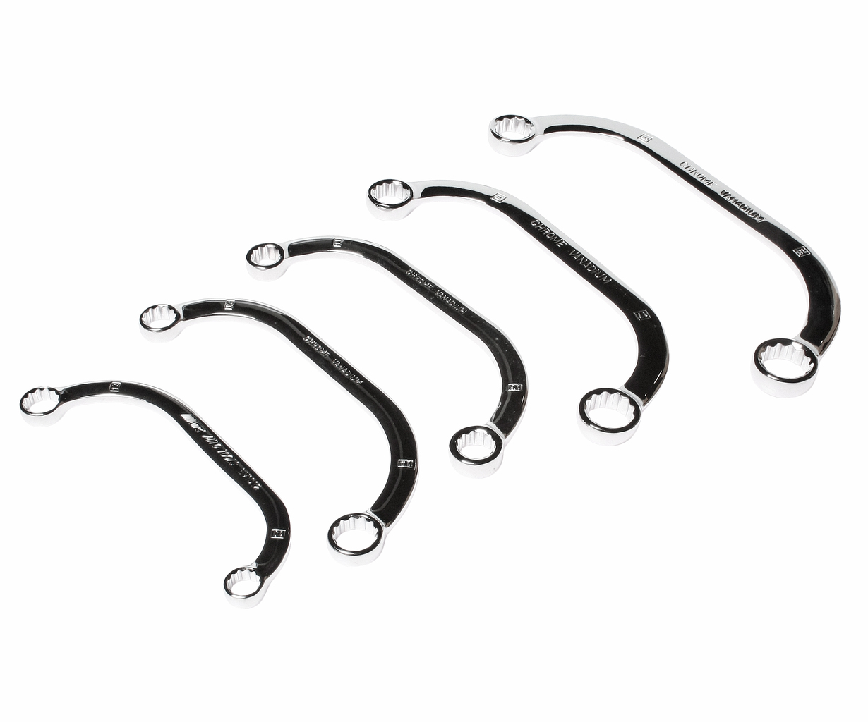 Особлива вигнута форма ключів дозволяє виконувати роботи в обмеженому просторі. Матеріал: хром-ванадієва сталь. Інструменти мають підвищену міцність. Розміри у комплекті (мм.): 10х12, 11х13, 12х14, 14х17, 16х18. Загальна кількість ключів: 5.