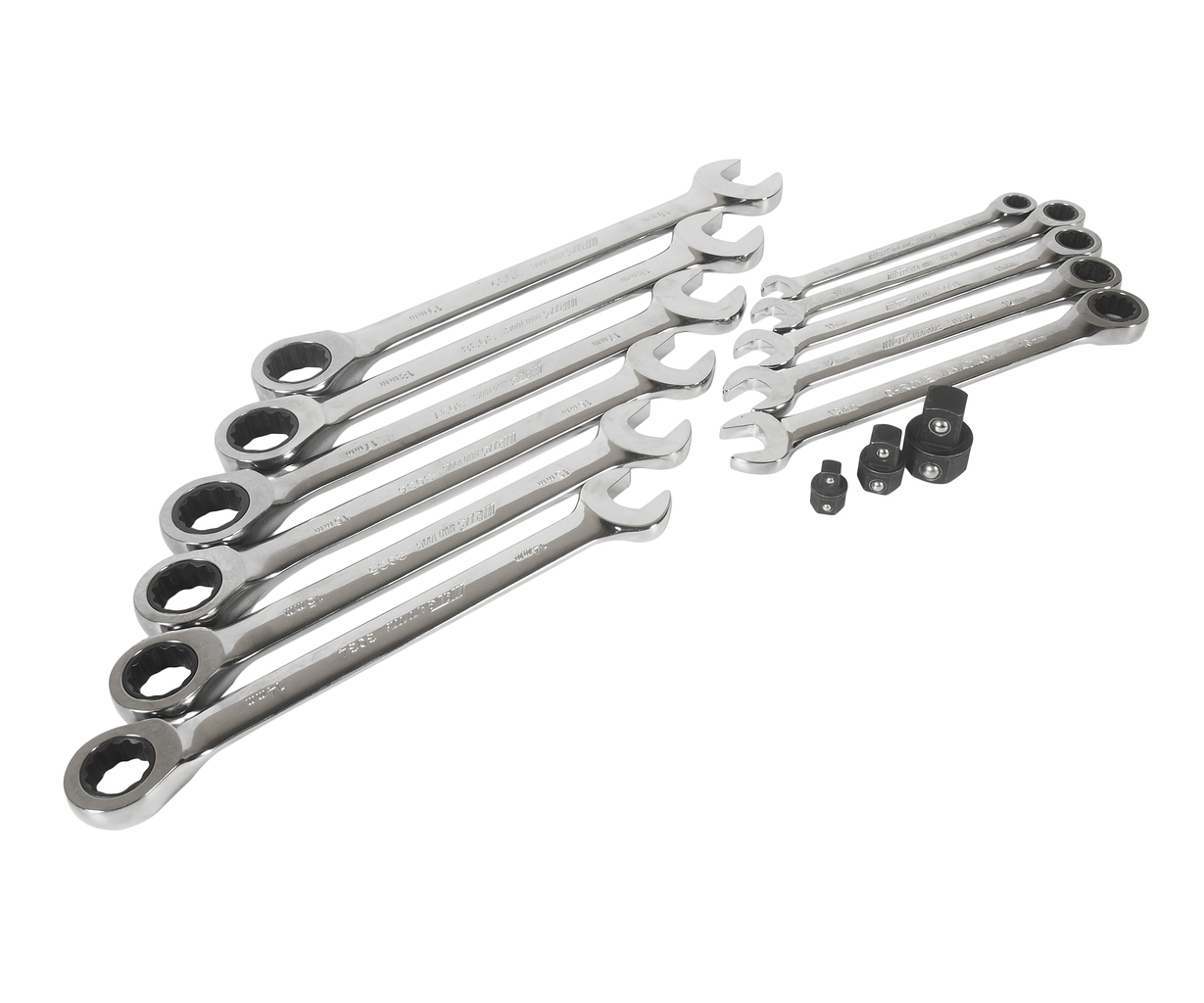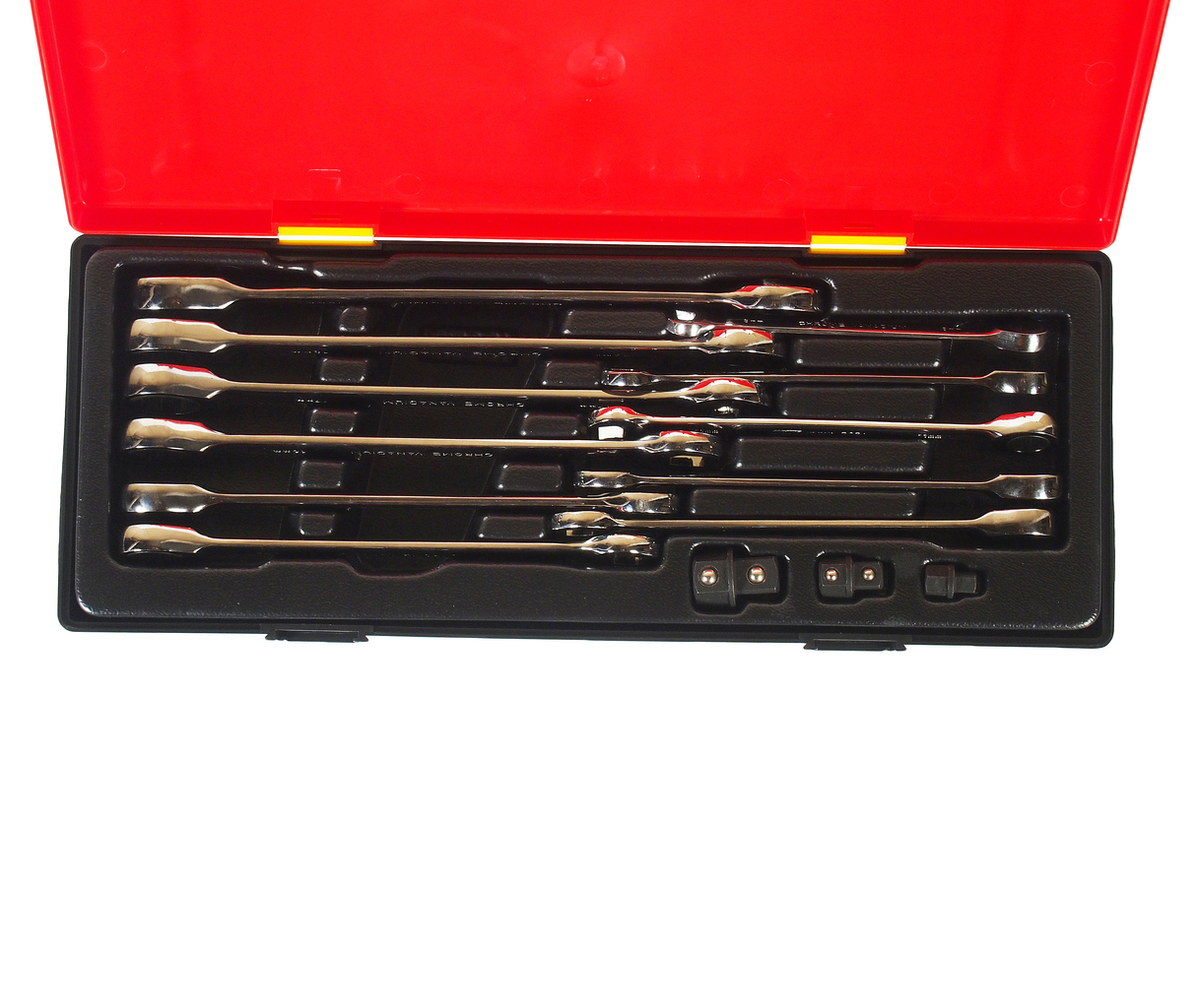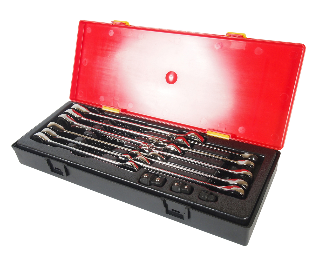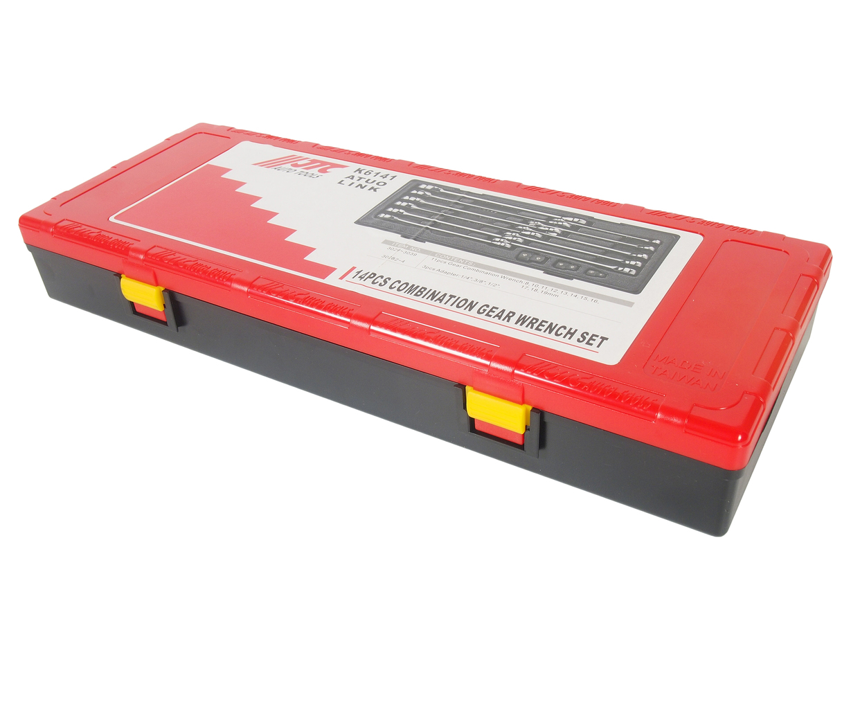 У комплекті: Артикули JTC-3029-3039: ключ ріжково-накидний з тріскачкою: 8, 10, 11, 12, 13, 14, 15, 16, 17, 18, 19 мм. – 11 шт. Артикули JTC-30282-4: адаптери 1/4; 3/8; 1/2-3 шт. Загальна кількість предметів: 14 шт. Комплект упакований у міцний презентабельний бокс. Габаритні розміри: 375/140/60 мм. (Д/Ш/В) Вага: 1910 гр.