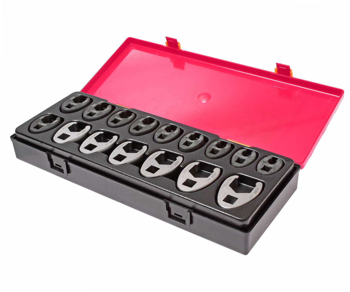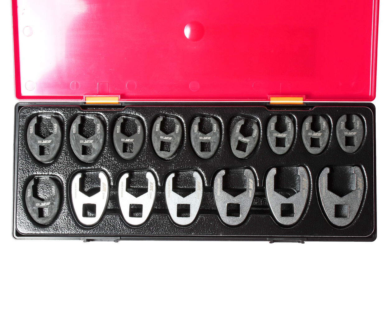 У комплекті: Артикул JTC-160510-160519: 3/8 ключ розрізний односторонній - 10 мм, 11 мм, 12 мм, 13 мм, 14 мм, 15 мм, 16 мм, 17 мм, 18 мм, 19 мм. - 10 шт. Артикул JTC-1925-1931: 1/2 ключ розрізний односторонній: 21 мм, 22 мм, 23 мм, 24 мм, 26 мм, 27 мм. - 6 шт. Загальна кількість предметів: 16 шт. Комплект упакований у міцний презентабельний бокс.