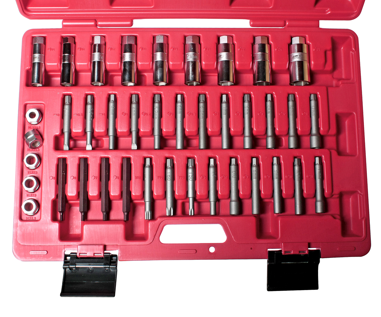 Комплект для обслуговування більшості марок автомобілів. У комплекті 39 предметів. У комплекті: 5 спецключів з виступами (вусами) під головку/ключ 22 мм. Список спецключів: 10.5x3.5 мм. - VW Golf (задня вісь), 12.5x3.5 мм. - VW Polo (передня вісь) 14.5x5 мм. - VW Golf, VW Polo, VW Passat, Audi 80 14.5x3 мм. - Austin Maestro 14x2.5 мм. - Mercedes Benz W203(C-class), W209(CLK) 9 головок довгих з неглибоким внутрішнім пазом під гайку (головна відмінність від звичайних довгих головок) та зовнішнім шестигранним профілем для фіксації ключем. Всередину головки вставляється штифт з шестигранним кінцевиком з одного боку і спецнаконечником з іншого боку. Список спецголовок: 14 (внутр) x19 (зовнішн) - Honda, Nissan 16 (внутр) x19 (зовнішн) - VW-Audi, Seat, Fiat 17 (внутр. )x19(зовнішн) - Ford, VW-Audi, Seat, Fiat 18(внутр)x22(зовнішн) - Ford, VW-Audi, Seat, Rover, Fiat, Opel, Peugeot, Renault, японські автомобілі 19(внутр)x22( зовнішній) - VW-Audi, Seat, Citroen, Fiat, Opel, Peugeot, Toyota 21(внутр)x22(зовнішн) - Mercedes Benz(W203), Chrysler, VW-Audi, Ford, японські автомобілі 22(внутр)x22(зовнішн) ) - VW-Audi, Seat, Citroen, Fiat, Opel, Peugeot, Renault, BMW 24(внутр)x22(зовнішн) - Volvo 27(внутр)x22(зовнішн) - VW-Audi, Citroen, Peugeot 25 штифтів для доступу до внутрішньої гайки стійки амортизатора крізь спецголовку з шестигранним кінцевиком під ключ/головку 10 мм. Список спецнаконечників штифтів, представлених у наборі: ЗОВНІШНІЙ ШЛИЦ 3 мм. - Mercedes Benz, Opel, Renault ЗОВНІШНІЙ ШЛИЦ 3.5 мм. - Chrysler, Ford, Citroen, Peugeot ЗОВНІШНІЙ ШЛИЦ 4 мм. - Citroen, Peugeot ВНУТРІШНІЙ ШЛИЦ 4 мм. - Nissan ВНУТРІШНІЙ ШЛИЦ 5.2 мм. - VW-Audi, Nissan ВНУТРІШНІЙ ШЛИЦ 6 мм. - VW-Audi, Renault ВНУТРІШНІЙ ШЛИЦ 6.3 мм. - Nissan ВНУТРІШНІЙ ШЛИЦ 7 мм. - VW-Audi, Seat, Fiat ВНУТРІШНІЙ ШЛИЦ 8 мм. - Seat, Fiat ВНУТРІШНІЙ ШЛИЦ 9 мм. - Японські автомобілі ВНУТРІШНІЙ ШЛИЦ 10 мм. - Seat, Fiat, Volvo ВНУТРІШНІЙ ШЛИЦ 12 мм. - Seat, Fiat ЗОВНІШНІЙ ШЕСТИГРАНИК 5 мм. - Honda ЗОВНІШНІЙ ШЕСТИГРАНИК 6 мм. - Seat, Fiat, Citroen, Peugeot, Ford, Opel, Renault, BMW, Японські автомобілі Зовнішній шестигранник 7 мм. - VW-Audi, Seat, Fiat, Citroen, Peugeot, Mercedes Benz (W203), Renault ЗОВНІШНІЙ ШЕСТИГРАНИК 8 мм. - Mercedes Benz ВНУТРІШНІЙ ШЕСТИГРАНИК 8 мм. - Mercedes Benz ВНУТРІШНІЙ ШЕСТИГРАНИК 9 мм. - Opel/Vauxhall, Chrysler ВНУТРІШНІЙ ШЕСТИГРАНИК 10 мм. - Chrysler, Ford, (може використовуватися як тримач біт або подовжувач спецштифтів) ВНУТРІШНІЙ ШЕСТИГРАНИК 11 мм. - Японські автомобілі ВНУТРІШНІЙ ПРОФІЛЬ D-обр. 5мм. - Nissan ВНУТРІШНІЙ ПРОФІЛЬ D-обр. 10мм. - Nissan, Ford ЗОВНІШНІЙ XZN/SPLINE M12 - Opel/Vauxhall ЗОВНІШНІЙ TORX T60 - Ford ЗОВНІШНІЙ TORX T50 - Nissan, Ford