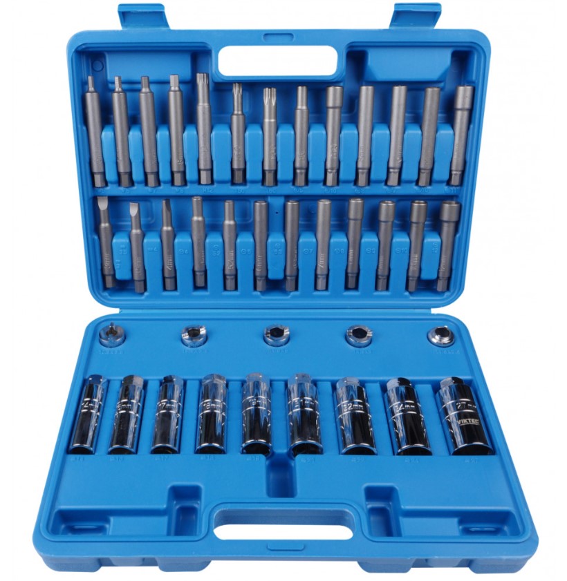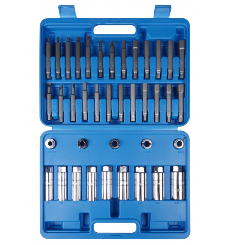 Набір для обслуговування більшості марок автомобілів. Комплектація: 5 спецключів з виступами (вусами) під головку/ключ 22 мм. Список спецключів: 10.5x3.5 мм. - VW Golf (задня вісь), 12.5x3.5 мм. - VW Polo (передня вісь) 14.5x5 мм. - VW Golf, VW Polo, VW Passat, Audi 80 14.5x3 мм. - Austin Maestro 14x2.5 мм. - Mercedes Benz W203(C-class), W209(CLK) 9 головок довгих з неглибоким внутрішнім пазом під гайку (головна відмінність від звичайних довгих головок) та зовнішнім шестигранним профілем для фіксації ключем.; Всередину головки вставляється штифт із шестигранним кінцевиком з одного боку та спецнаконечником з іншого боку. Список спецголовок: 14 (внутр) x19 (зовнішн) - Honda, Nissan 16 (внутр) x19 (зовнішн) - VW-Audi, Seat, Fiat 17 (внутр) x19 (зовнішн) - Ford, VW-Audi, Seat, Fiat 18 (внутр)x22(зовнішн) - Ford, VW-Audi, Seat, Rover, Fiat, Opel, Peugeot, Renault, японські автомобілі 19(внутр)x22(зовнішн) - VW-Audi, Seat, Citroen, Fiat, Opel, Peugeot , Toyota 21(внутр)x22(зовнішн) - Mercedes Benz(W203), Chrysler, VW-Audi, Ford, японські автомобілі 22(внутр)x22(зовнішн) - VW-Audi, Seat, Citroen, Fiat, Opel, Peugeot, Renault, BMW 24(внутр)x22(зовнішн) - Volvo 27(внутр)x22(зовнішн) - VW-Audi, Citroen, Peugeot; 25 штифтів для доступу до внутрішньої гайки стійки амортизатора крізь спецголовку із шестигранним кінцівком під ключ/головку 10 мм. Список спецнаконечників штифтів представлених у наборі: ЗОВНІШНІЙ ШЛИЦ 3 мм. - Mercedes Benz, Opel, Renault ЗОВНІШНІЙ ШЛИЦ 3.5 мм. - Chrysler, Ford, Citroen, Peugeot ЗОВНІШНІЙ ШЛИЦ 4 мм. - Citroen, Peugeot ВНУТРІШНІЙ ШЛИЦ 4 мм. - Nissan ВНУТРІШНІЙ ШЛИЦ 5.2 мм. - VW-Audi, Nissan ВНУТРІШНІЙ ШЛИЦ 6 мм. - VW-Audi, Renault ВНУТРІШНІЙ ШЛИЦ 6.3 мм. - Nissan ВНУТРІШНІЙ ШЛИЦ 7 мм. - VW-Audi, Seat, Fiat ВНУТРІШНІЙ ШЛИЦ 8 мм. - Seat, Fiat ВНУТРІШНІЙ ШЛИЦ 9 мм. - Японські автомобілі ВНУТРІШНІЙ ШЛИЦ 10 мм. - Seat, Fiat, Volvo ВНУТРІШНІЙ ШЛИЦ 12 мм. - Seat, Fiat ЗОВНІШНІЙ ШЕСТИГРАНИК 5 мм. - Honda ЗОВНІШНІЙ ШЕСТИГРАНИК 6 мм. - Seat, Fiat, Citroen, Peugeot, Ford, Opel, Renault, BMW, Японські автомобілі Зовнішній шестигранник 7 мм. - VW-Audi, Seat, Fiat, Citroen, Peugeot, Mercedes Benz (W203), Renault ЗОВНІШНІЙ ШЕСТИГРАНИК 8 мм. - Mercedes Benz ВНУТРІШНІЙ ШЕСТИГРАНИК 8 мм. - Mercedes Benz ВНУТРІШНІЙ ШЕСТИГРАНИК 9 мм. - Opel/Vauxhall, Chrysler ВНУТРІШНІЙ ШЕСТИГРАНИК 10 мм. - Chrysler, Ford, (може використовуватися як тримач біт або подовжувач спецштифтів) ВНУТРІШНІЙ ШЕСТИГРАНИК 11 мм. - Японські автомобілі ВНУТРІШНІЙ ПРОФІЛЬ D-обр. 5мм. - Nissan ВНУТРІШНІЙ ПРОФІЛЬ D-обр. 10мм. - Nissan, Ford ЗОВНІШНІЙ XZN/SPLINE M12 - Opel/Vauxhall ЗОВНІШНІЙ TORX T60 - Ford ЗОВНІШНІЙ TORX T50 - Nissan, Ford