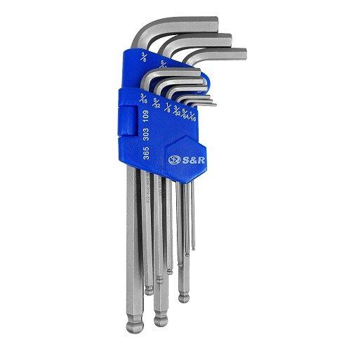Набір шестигранних ключів S&R для складального механічного виробництва, станцій технічного обслуговування. Матеріал - хром-ванадієва сталь. Обробка поверхні – матування. Конструктивні особливості – хром-нікелеве покриття. Робочий діаметр - 1/16; 5/64; 3/32; 1/8; 5/32; 3/16; 1/4; 5/16; 3/8'