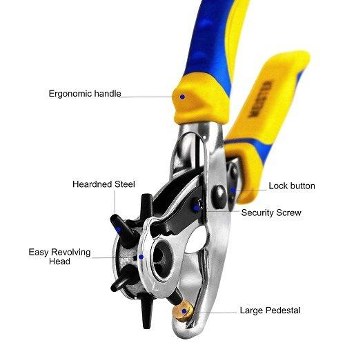 Дироколі 225 мм для пробивання отворів у шкірі, тканині, картоні, пластиці. Робочі діаметри дірокола такі: 2; 2.5; 3; 3.5; 4; 4.5 мм.