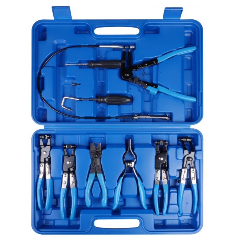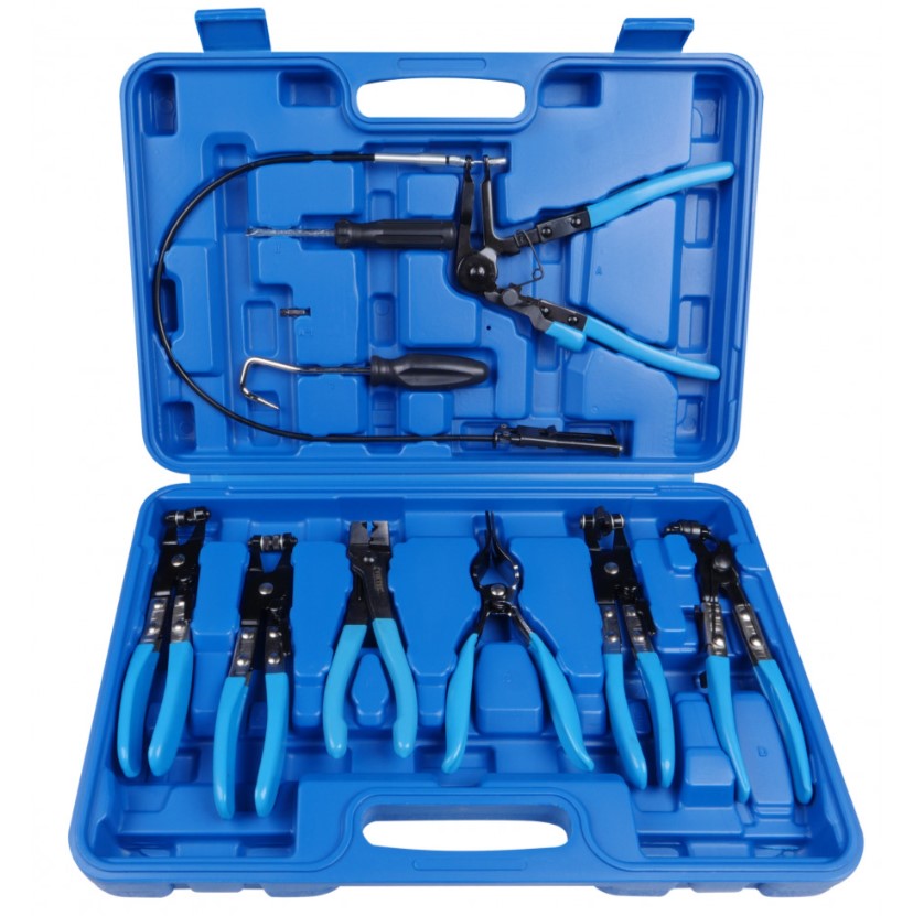 Комплектація: Кліщі для пружинних хомутів із ізольованим тросиком L=630 мм. Кліщі для пружинних хомутів вигнуті. Кліщі для зняття хомутів прямі. Кліщі для хомутів CLIC-R. Кліщі для зняття шлангів. Кліщі для зняття плоских хомутів. Кліщі для зняття плоских хомутів вигнуті. Викрутка. Гак для зняття шлангів.