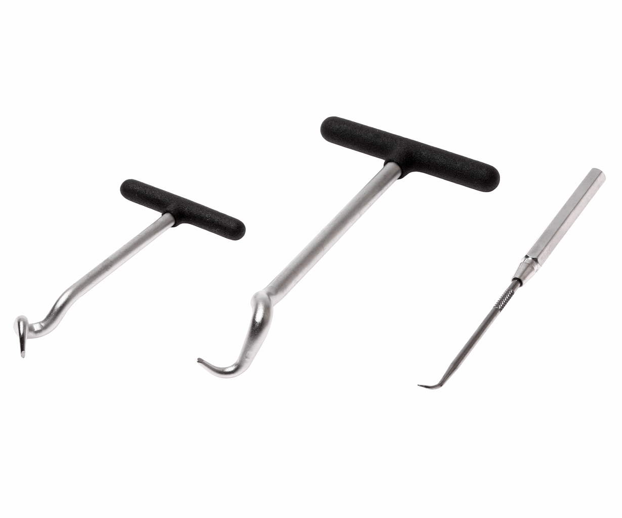 Дозволяє швидко і без особливих зусиль знімати кільця ущільнювачів або сальники різних типів. Особливий кут гака забезпечує більш ефективну роботу із вилучення сальників. У комплекті 3 гаки різної довжини та форми для різних видів робіт. Спосіб застосування: сальник зачепити гаком і потягнути. Довжина: 117/165/150 мм.