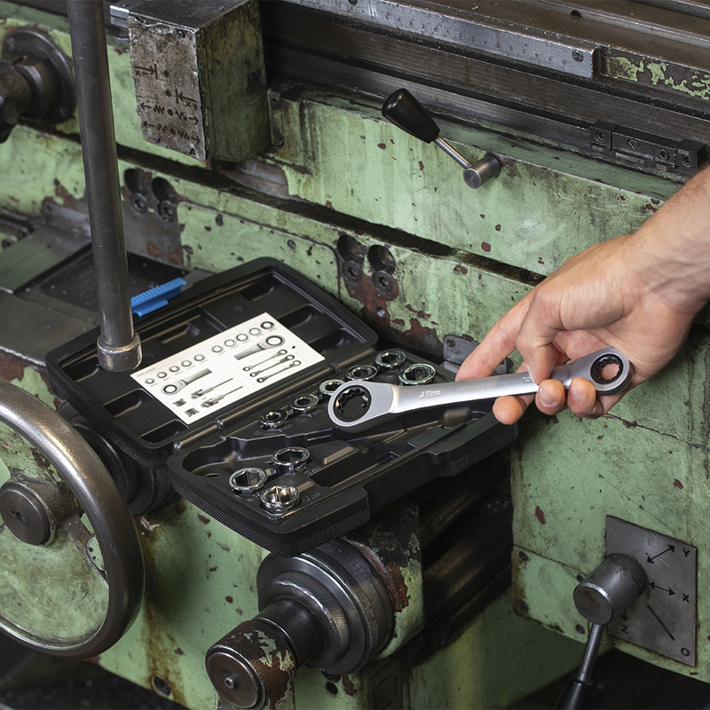 Ключ з тріскачкою та шарніром служить для відкручування та закручування різьбових з'єднань з шести або дванадцятигранними елементами кріплення. Завдяки тріскачці відсутня потреба перекладання ключа, а насадки дозволяють працювати з болтами різних розмірів. 11 елементів набору дозволяють використання повного складу ключів розміром 8-19мм. Універсальні можливості ключа дозволяють його використовувати як у майстернях, так і в ремонтно-будівельних та монтажних роботах.