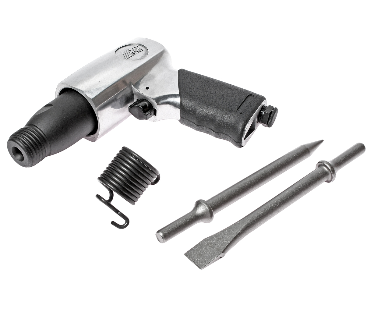 Комплектація Пневматичний молоток. Зубила2 шт. Пружина - утримувач; Призначений для ремонтних робіт з можливістю використання ударного механізму. ; Технічні характеристики Зубила довжиною 175 мм. Витрата повітря: 110 л/хв. Звуковий тиск: 99 дБа. Вібрація: 13,5 м/с. Швидкість: 3200 уд/хв. Хід поршня: 67 мм. Тиск: 6,1 атм. Різьблення вхід. отвори: 1/4; Довжина: 175 мм. ; Важливі рекомендації Заборонено подавати високий тиск у систему більше 8 бар. Заборонено використання пневмоінструменту при температурі близької до 0; Уникайте потрапляння піску та бруду всередину пневмоінструменту. Бруд і пісок працюють як абразив і стирають пелюстки крутного механізму. Уникайте потрапляння води всередину корпусу. Наявність води призводить до корозії та руйнування крутного механізму. Один раз на три місяці необхідно проводити профілактичне чищення пневмоінструменту. Посадковий квадрат, пружини, кільця ущільнювачів, ущільнювачі, підшипники, лопатки ротора, металеві кульки, золотник клапана пневматичного інструменту - якщо такі входять в конструкцію даної моделі, є витратними матеріалами, і не покриваються гарантійними зобов'язаннями виробника у разі деформації або пошкоджень. ; Обов'язкова умова Заявлені технічні параметри пневмоінструмент показує тільки при дотриманні всіх вимог, що висуваються до якості та обсягу повітря, що подається, а також до умов експлуатації. Обов'язковою умовою експлуатації є встановлення в пневмолінію блоку підготовки повітря, що складається з: регулятора тиску; вологовідділювача; лубрикатора для подачі мастила в робочий простір пневмоінструменту.