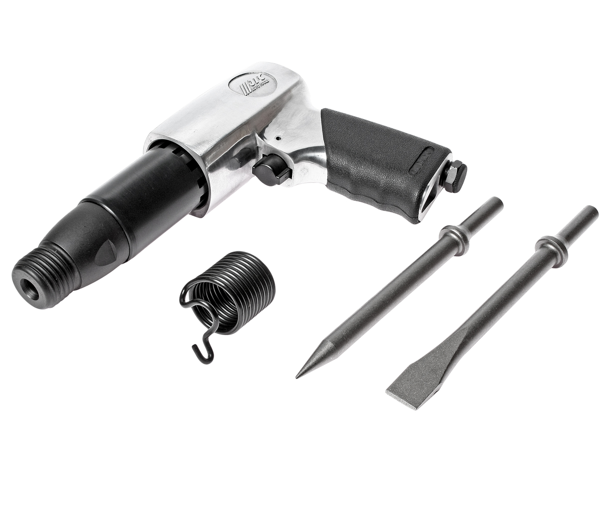Комплектація Пневматичний молоток. Зубила2 шт. Пружина - утримувач; Призначений для ремонтних робіт з можливістю використання ударного механізму. ; Технічні характеристики Зубила довжиною 175 мм. Витрати повітря: 110 л/min. Звуковий тиск: 96 дБа. Вібрація: 11 м/с. Швидкість: 2100 уд/хв. Хід поршня: 89 мм. Тиск: 6,2 бар (90 PSI). Різьблення вхід. отвори: 1/4; Довжина: 225 мм. Вага нетто: 2000 гр. ; Важливі рекомендації Заборонено подавати високий тиск у систему більше 8 бар. Заборонено використання пневмоінструменту при температурі близької до 0; Уникайте потрапляння піску та бруду всередину пневмоінструменту. Бруд і пісок працюють як абразив і стирають пелюстки крутного механізму. Уникайте потрапляння води всередину корпусу. Наявність води призводить до корозії та руйнування крутного механізму. Один раз на три місяці необхідно проводити профілактичне чищення пневмоінструменту. Посадковий квадрат, пружини, кільця ущільнювачів, ущільнювачі, підшипники, лопатки ротора, металеві кульки, золотник клапана пневматичного інструменту - якщо такі входять в конструкцію даної моделі, є витратними матеріалами, і не покриваються гарантійними зобов'язаннями виробника у разі деформації або пошкоджень. ; Обов'язкова умова Заявлені технічні параметри пневмоінструмент показує тільки при дотриманні всіх вимог, що висуваються до якості та обсягу повітря, що подається, а також до умов експлуатації. Обов'язковою умовою експлуатації є встановлення в пневмолінію блоку підготовки повітря, що складається з: регулятора тиску; вологовідділювача; лубрикатора для подачі мастила в робочий простір пневмоінструменту.