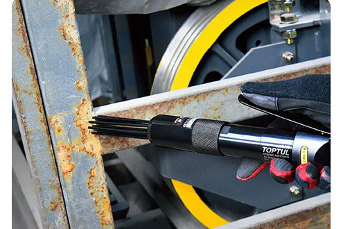 Молоток пневматичний зачисний голчастий, призначений для видалення іржі, накипу, задирок, фарби, шлаку з металу, зняття напруги після зварювання, очищення і додання шорсткості бетону. Особливо ефективний, оскільки незалежні один від одного удари кожної загартованої сталевої голки, забезпечують досягнення всіх точок складного рельєфу оброблюваної поверхні.