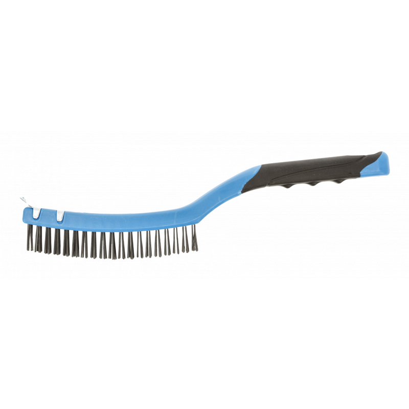 Щітка призначена для видалення іржі, фарби, лаку та складних забруднень, а також для очищення зварних швів та різьблення. Твердий пластиковий скребок на кінці головки полегшує та прискорює роботу. Щітка виготовлена з твердого сталевого дроту, міцно вмонтованого у пластиковий корпус. Рукоятка має профільовану форму, що полегшує утримання інструменту та підвищує ефективність роботи.