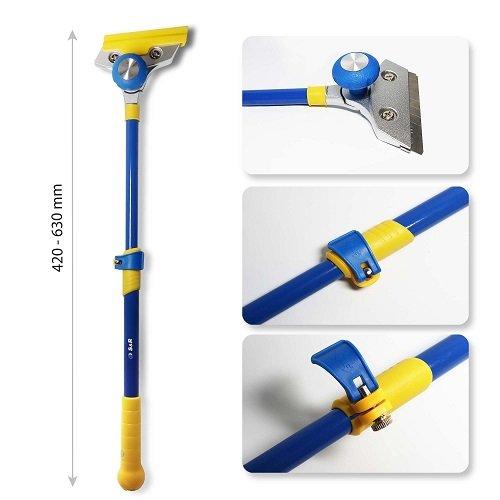 Зручна телескопічна рукоятка дозволяє працювати на висоті та у важкодоступних місцях. Ергономічне покриття ручки дає можливість працювати довгий час без втоми. Рукоятку можна подовжити від 420-630 мм. Ширина леза 100 мм дозволяє захопити досить широку площу для зняття.