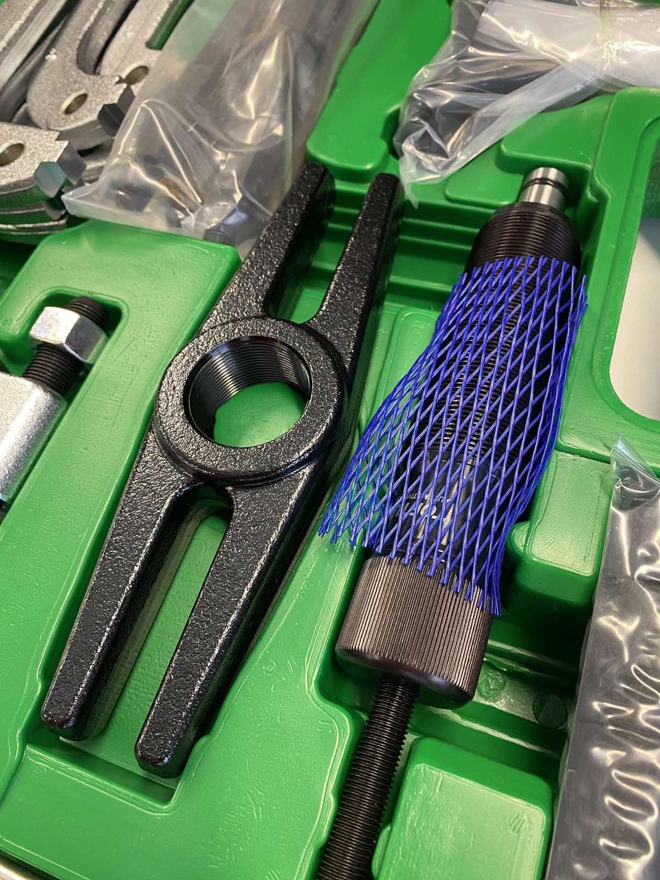 Весь комплект компактно сложен в высокопрочном пластиковом чемоданчике с удобной рукояткой, благодаря чему гидравлический съемник обладает высокой портативностью.