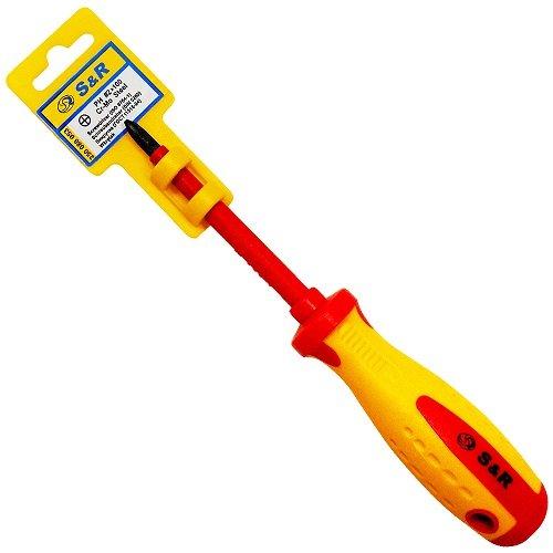 Викрутка S&R із хром-молібденової сталі для виконання електромонтажних робіт. Жало вливається у двокомпонентну діелектричну рукоятку у три етапи. Жало на 70% покрито діелектричним матеріалом.