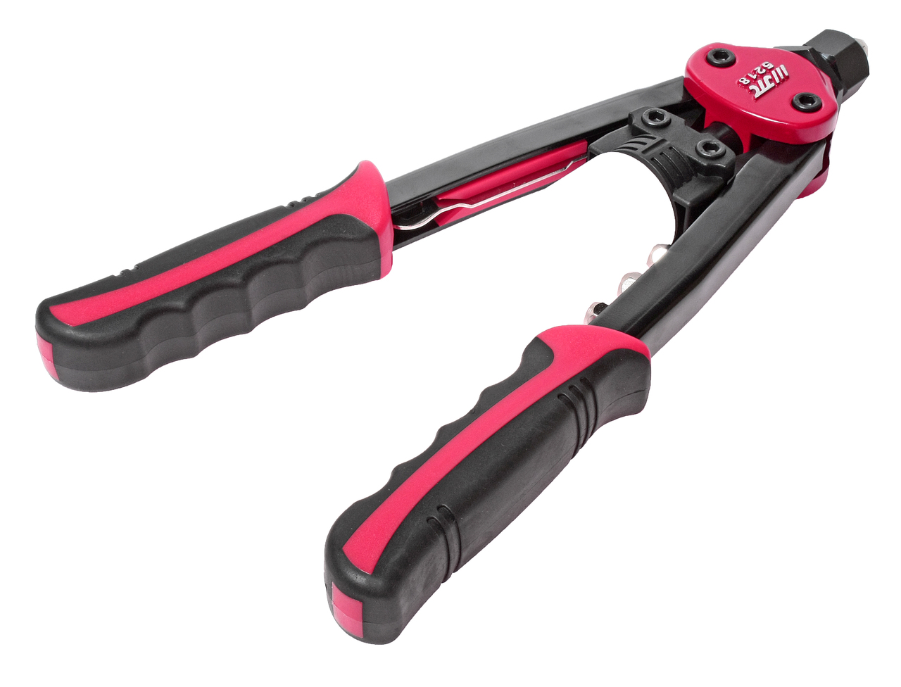 Комплектація Заклепочник - 1 шт. Насадки під різні розміри заклепок – 4 шт. Сервісний ключ – 1 шт. ПЕ контейнер – 1 шт. Алюмінієвий корпус, хром-молібденові ручки з двоколірними накладками. Кожух для захоплень виконаний із хром-ванадієвої сталі, а самі захоплення зі сталі марки SCM435. Оснащений ПЕ контейнером для збирання стрижнів, а також секцією для зберігання насадок та монтажного ключа. Розміри: 3.2 мм (1/8;) 4.0 мм (5/32;) 4.8 мм (3/16;) 6.4 мм (1/4;). Загальна довжина: 325 мм.