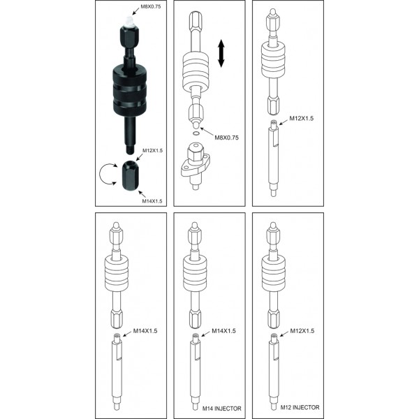Комплектація Знімач форсунок1 шт. Адаптери2 шт. Застосовується для зняття дизельних форсунок BOSCH та LUCAS. Підходить для демонтажу форсунок, що прикипіли. Застосування інструменту значно знижує ризик пошкодження форсунок. Комплектується двома адаптерами: перший М8, другий М12 на М14. Інструмент простий у застосуванні та відрізняється високою ефективністю. Різьблення: М8х0, 75, М12х1, 5 для форсунок BoschМ14х1, 5 для вантажівок Volvo, Scania. Порядок робіт Перед початком роботи форсунка та колодязь, в якому вона знаходиться, обробіть невеликою кількістю мастила, а також при необхідності змастіть частини зйомника, що полегшує провертання форсунки та гайок інструменту; Встановіть інструмент на форсунку; За допомогою динамометричного ключа наверніть інструмент на форсунку; Зворотним молотком зусилля через інструмент передається форсунці доти, доки вона не почне прокручуватися; Форсунка викручується із головки блоку циліндрів; Якщо все зроблено правильно і без перевищення допустимих зусиль, форсунка (а також шайба ущільнювача) легко витягується з головки блоку циліндрів.