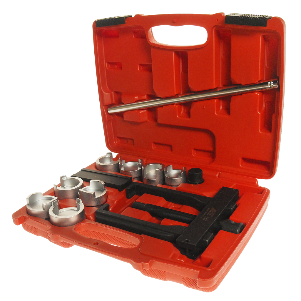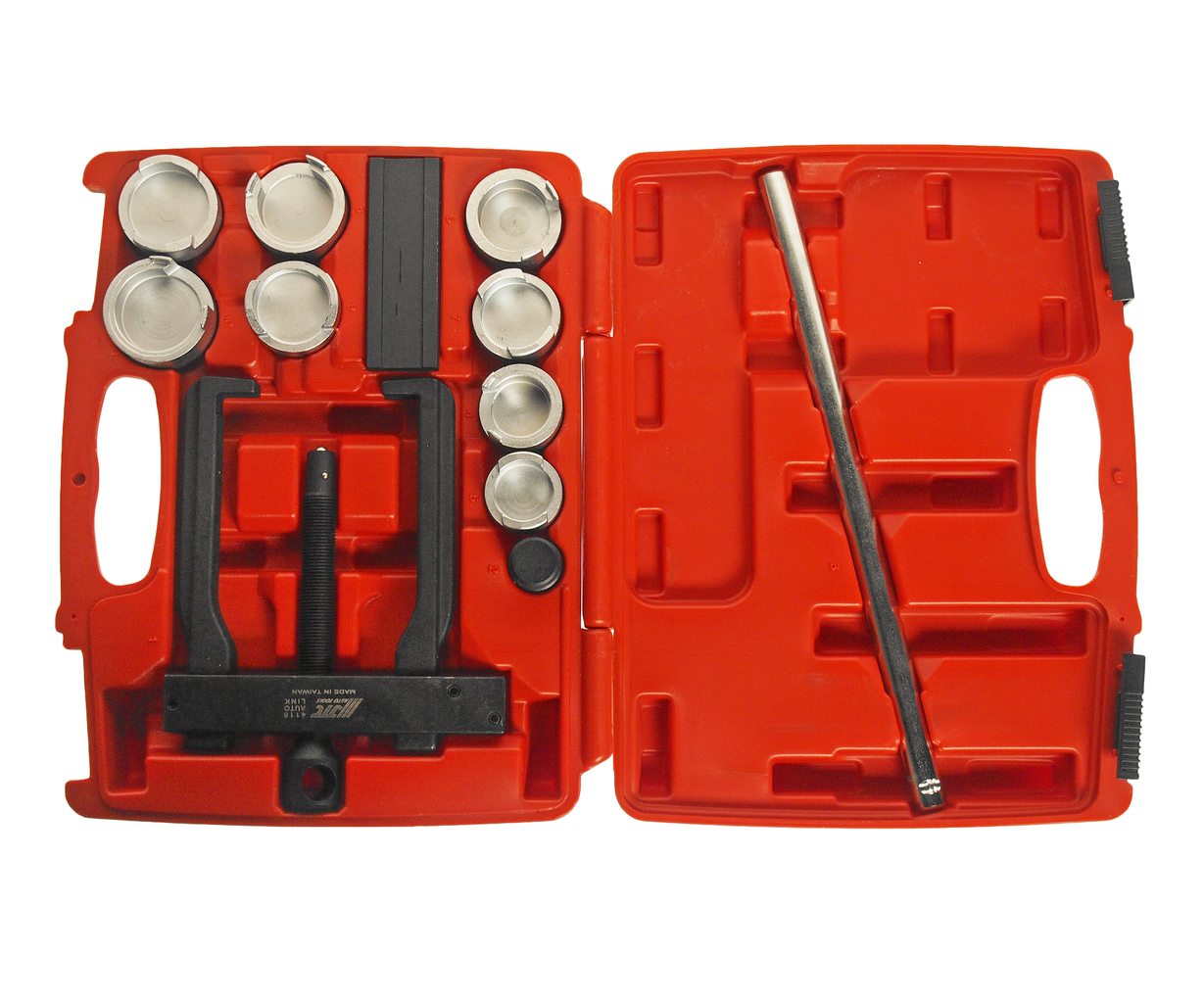 Комплектація Знімач Оправка для установки (діаметр 14 мм) Воротки Оправка (діаметр 28 мм) Оправка (діаметр 28 мм) Оправка (діаметр 34 мм) Оправка (діаметр 32 мм) Оправка (діаметр 35 мм) Оправка (діаметр 34 мм) діаметр 38 мм) Оправлення (діаметр 37 мм) Насадка на захвати; Запатентований. Використовується для встановлення/зняття хрестовини вантажних автомобілів. ; Особливість патенту Завдяки регульованим захопленням, знімач підходить для хрестовин різних діаметрів. Завдяки спеціальній конструкції полегшує процедуру заміни: надійно фіксується хрестовина, підшипники демонтуються без пошкоджень, з високою точністю та мінімальними зусиллями. За допомогою інструмента можливий демонтаж карданного шарніру. ; Застосування Вантажні автомобілі середньої вантажопідйомності Mitsubishi (Canter), Nissan, Toyota, Mazda, Isuzu та інші. ;