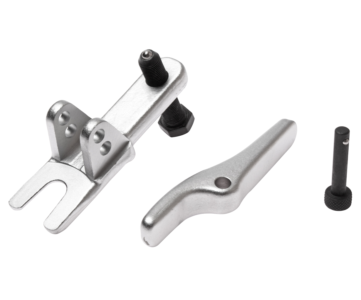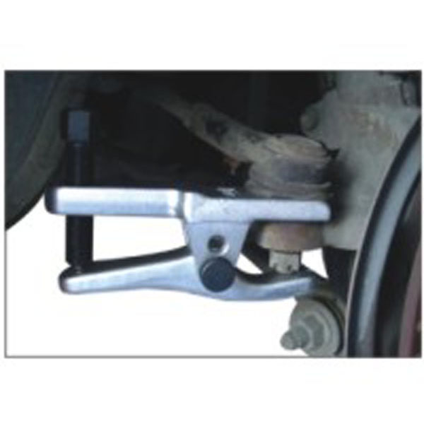 Комплектація Знімач двопозиційний. ; Спеціальна конструкція з двопозиційним важелем дозволяє використовувати знімач для різних автомобілів. Також підходить для зняття кульових опор кермового керування та підвісок на легкових автомобілях. Двопозиційний важіль дозволяє вибрати 2 робочі діапазони з максимум 30 мм і 56 мм. ; Технічні характеристики Ширина зіва: 22 мм. ; Автомобілі європейського виробництва. ; Порядок роботи Підніміть та встановіть автомобіль на опори. Зніміть колесо, попередньо послабивши болти кріплення на землі. Відкрутіть гайку кріплення кульової опори. Встановіть знімач на важіль. Провертаючи гайковим ключем гвинт зйомника, випресуйте кульову опору.