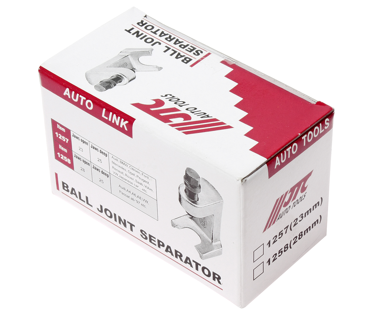 Комплектація Знімач кульових опор. ; Призначений для зняття кульових опор важеля кермового керування, поперечної тяги і т.д. Пристосований для роботи у важкодоступних місцях. ; Застосування Audi, BMW, Cltroen, Ford, Mercedes, Opel, Peugeot, Renault, Rover, Saab, Volvo, VW, а також автомобілі японського та азіатського виробництва. ; Технічні характеристики Ширина зіва: 23 мм. Глибина зіва: 25 мм. ;