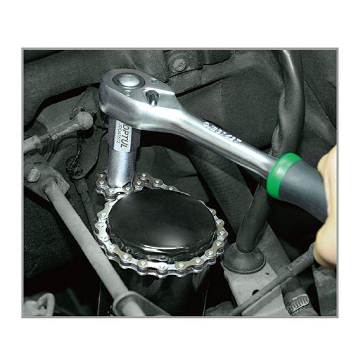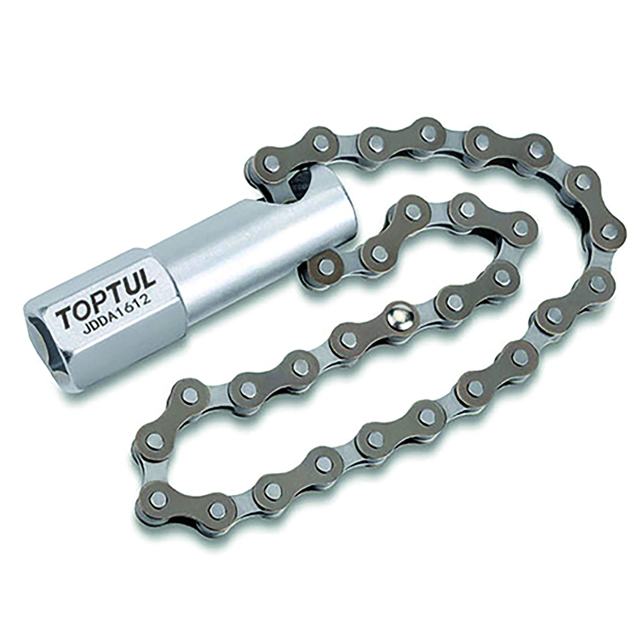 Знімач м/фільтра ланцюгової d120мм TOPTUL JDDA1612. Видаляє масляні фільтри діаметром до 4-11/16"(120 мм). Ланцюговий спосіб дозволяє щільно утримувати масляний фільтр. Використовуйте з приєднувальним квадратом 1/2" або гайковим ключем 13/16" (21 мм).