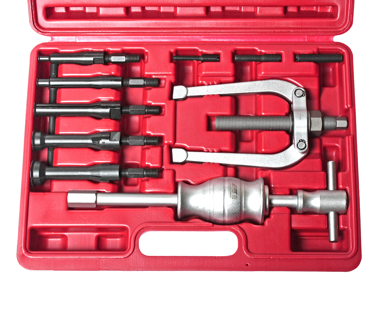 Комплектація Знімач (62 мм) – 1 шт.; Ударний знімач – 1 шт.; Захоплення: 8-11 мм, 12-17 мм, 18-23 мм, 24-29 мм, 30-34 мм – 5 шт.; Подовжувачі різьблення: М10х1.5РМ10х1.5Р/М8х1.25РМ10х1.5Р/М6х1.0Р - 3 шт. Застосовується для підшипників із внутрішнім діаметром: 8-34 мм. Важливі рекомендації Інструмент має бути встановлений у підшипник строго по осі підшипника (тобто рукоятка знімника повинна бути під кутом 90к площині підшипника). Недотримання цієї рекомендації може спричинити деформацію підшипника під час вилучення.