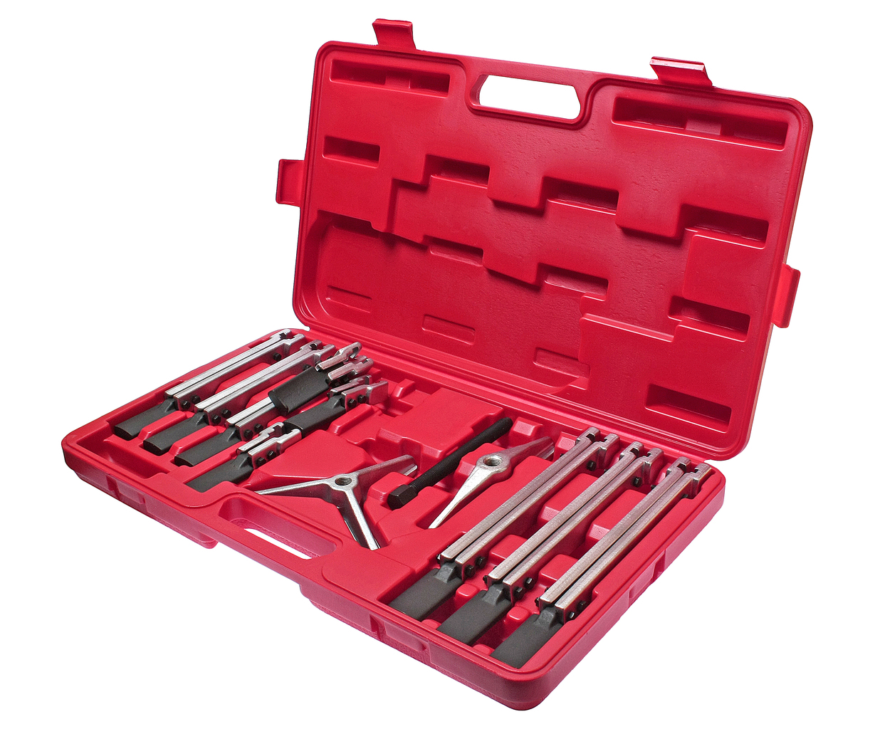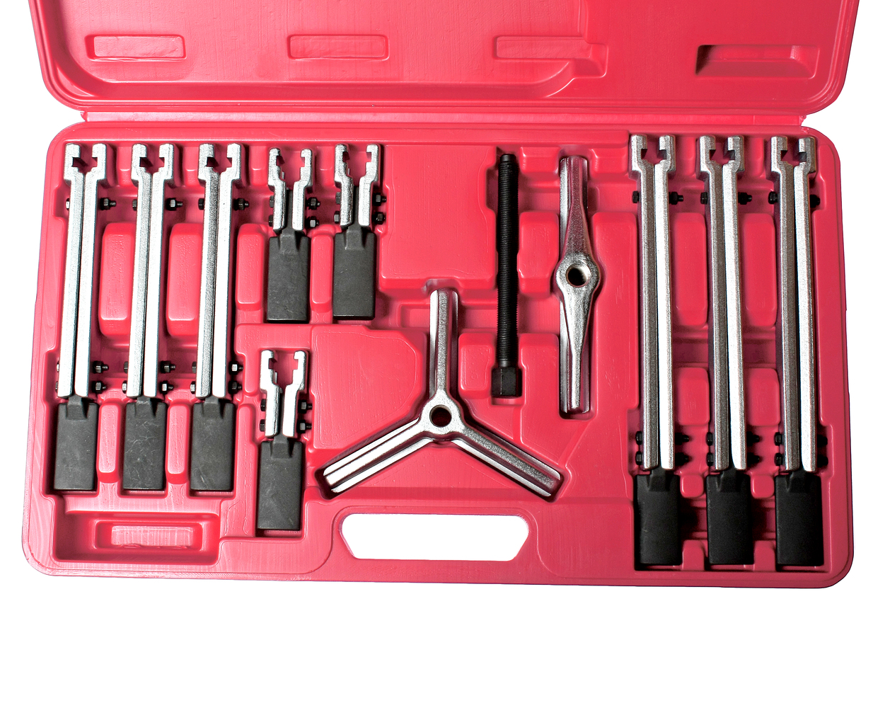 Комплектація Траверса подвійна 180 Траверса потрійна 120 Ходовий гвинт L = 145 мм; Захоплення ковзні 3 шт. товщина 6 мм; довжина 100мм; ширина лапки 27 мм; товщина лапки 3.6 мм; Захоплення ковзні 3 шт. товщина 6 мм, довжина 200мм, ширина лапки 27 мм, товщина лапки 3.6 мм; Захоплення ковзні 3 шт. товщина 6 мм, довжина 250мм, ширина лапки 27 мм, товщина лапки 3.6 мм; У комплект входять захоплення різної довжини, які дозволяють працювати у вузьких та важкодоступних місцях. Інструмент виготовлений з хромованадієвої сталі, кована штампування. Комплект пристосований для розміщення на стенді. Регульована глибина захвату забезпечує роботу з різними деталями. Робоча частина захватів знімника є загострені гаки, переміщення яких дозволяє використовувати знімач як для внутрішнього, так і для зовнішнього захоплення. Висота захватів: 100, 200, 250 мм – кожного по 3 шт. При роботі зі знімачем рекомендується одягати захисні окуляри. Захоплення виготовлені методом точного лиття. Накатане метричне різьблення з дрібним кроком. Конусна опора ходового гвинта. Універсальний (2-х та 3-х лапий). Застосування Призначений для зняття підшипників із різними зовнішніми діаметрами кілець. Також застосовується для демонтажу, шківів, шестерень із захопленням за зовнішню частину деталі, і де це необхідно і можливо технологічно, за внутрішню, перевстановивши захоплення. Важливі рекомендації Якщо немає навантаження, то ходовий гвинт знімач повинен майже без зусиль пересуватися в траверсі з малим люфтом. Ходовий гвинт і різьблення ходового гвинта знімач підшипника треба тримати в чистоті і змащеними. Брудний гвинт і різьблення ходового гвинта веде до погіршення якості експлуатації гвинтового знімач підшипника, а в подальшому до його поломки. Увага! Якщо під час роботи відбувається деформація елементів знімання, негайно необхідно припинити роботу та знизити подальше навантаження на інструмент.
