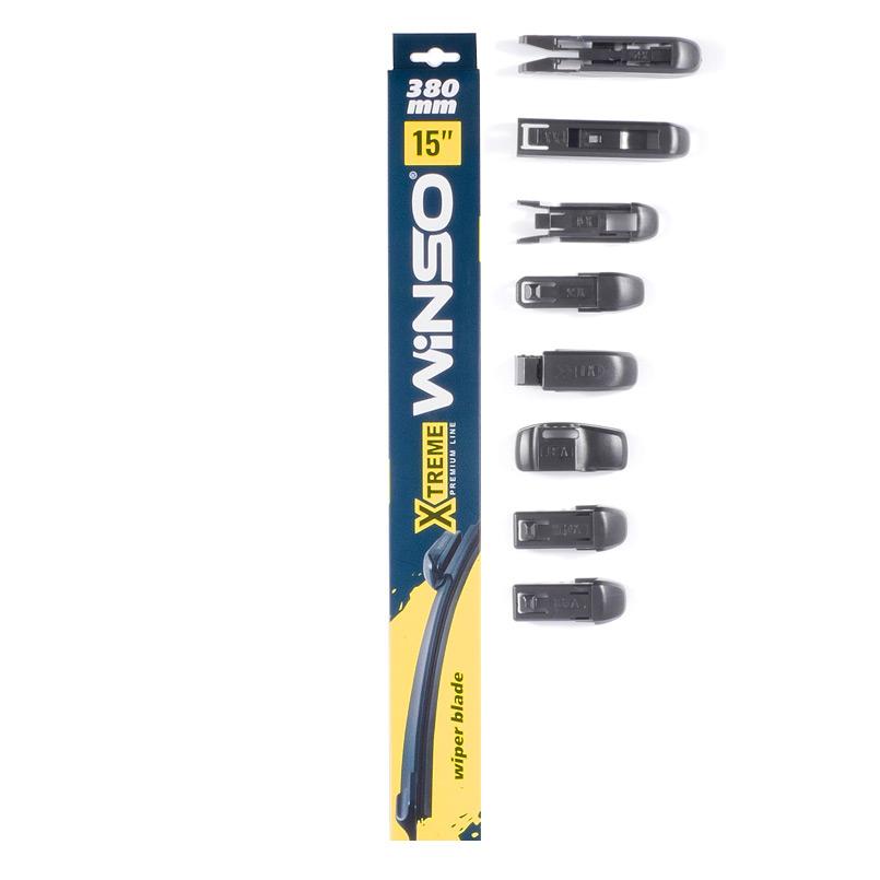 Двірники Winso X Treme безкаркасні 380мм. Winso Xtreme-це безкаркасні склоочисники преміум-класу з усіма типами адаптерів в комплекті, які підходять для 99% автомобілів. Конструкція безкаркасних склоочисників XTREME забезпечує рівномірне прилягання їх до вітрового скла незалежно від його форми. Аеродинамічний спойлер забезпечує високу ефективність очищення на великій швидкості.Гумове лезо склоочисників Winso Xtreme виготовлені з багатокомпонентних елементів високої якості з додаванням натурального каучуку. Графітове покриття сприяє безшумній роботі і експлуатації протягом тривалого часу.Склоочисники Winso XTREME виготовлені з дотриманням високих стандартів якості. Стійкі до негативного впливу зовнішнього середовища, зберігають свої властивості при будь-яких погодних умовах.