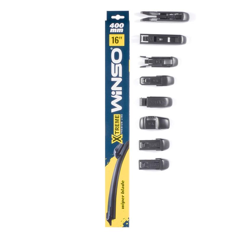 Дворники Winso X Treme безкаркасні 400мм. Winso Xtreme-це безкаркасні склоочисники преміум-класу з усіма типами адаптерів в комплекті, які підходять для 99% автомобілів. Конструкція безкаркасних склоочисників XTREME забезпечує рівномірне прилягання їх до вітрового скла незалежно від його форми. Аеродинамічний спойлер забезпечує високу ефективність очищення на великій швидкості.Гумове лезо склоочисників Winso Xtreme виготовлені з багатокомпонентних елементів високої якості з додаванням натурального каучуку. Графітове покриття сприяє безшумній роботі і експлуатації протягом тривалого часу.Склоочисники Winso XTREME виготовлені з дотриманням високих стандартів якості. Стійкі до негативного впливу зовнішнього середовища, зберігають свої властивості при будь-яких погодних умовах.