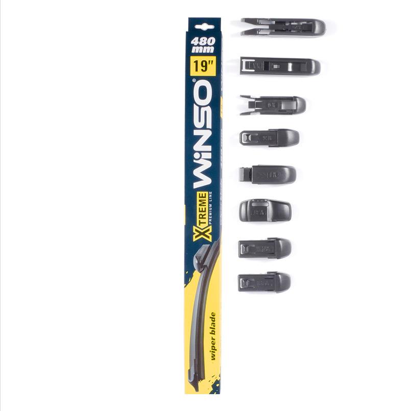 Дворники Winso X Treme 480мм. Winso Xtreme-це безкаркасні склоочисники преміум-класу з усіма типами адаптерів в комплекті, які підходять для 99% автомобілів. Конструкція безкаркасних склоочисників XTREME забезпечує рівномірне прилягання їх до вітрового скла незалежно від його форми. Аеродинамічний спойлер забезпечує високу ефективність очищення на великій швидкості.Гумове лезо склоочисників Winso Xtreme виготовлені з багатокомпонентних елементів високої якості з додаванням натурального каучуку. Графітове покриття сприяє безшумній роботі і експлуатації протягом тривалого часу.Склоочисники Winso XTREME виготовлені з дотриманням високих стандартів якості. Стійкі до негативного впливу зовнішнього середовища, зберігають свої властивості при будь-яких погодних умовах.