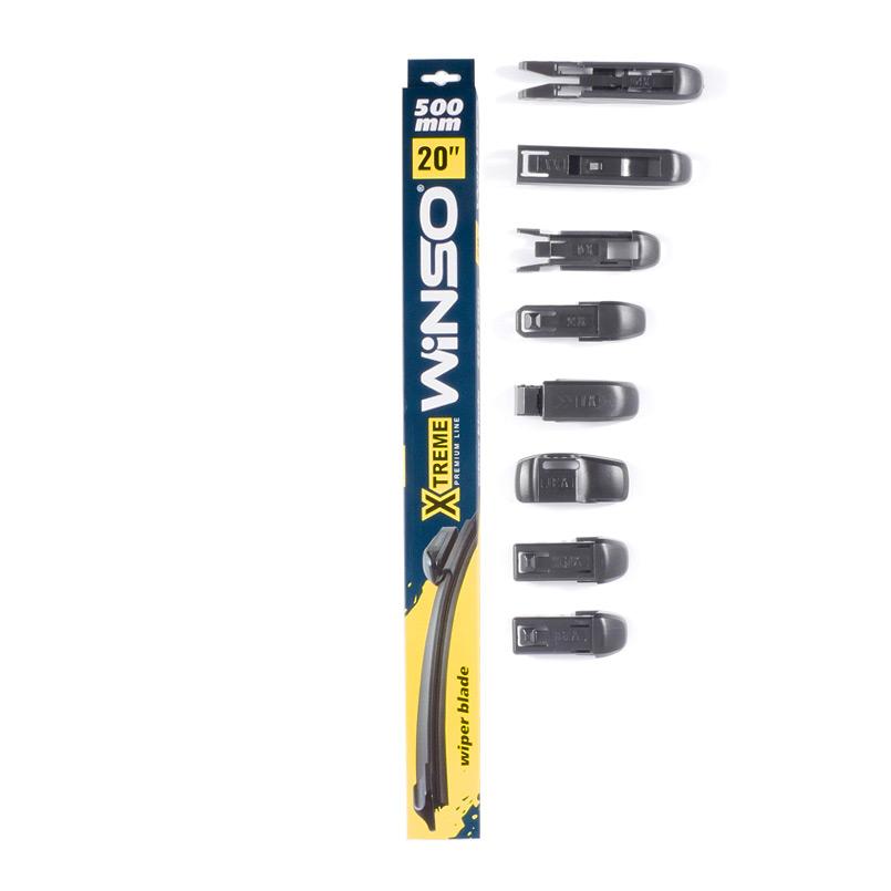 Двірники Winso X Treme безкаркасні 500мм. Winso Xtreme-це безкаркасні склоочисники преміум-класу з усіма типами адаптерів в комплекті, які підходять для 99% автомобілів. Конструкція безкаркасних склоочисників XTREME забезпечує рівномірне прилягання їх до вітрового скла незалежно від його форми. Аеродинамічний спойлер забезпечує високу ефективність очищення на великій швидкості.Гумове лезо склоочисників Winso Xtreme виготовлені з багатокомпонентних елементів високої якості з додаванням натурального каучуку. Графітове покриття сприяє безшумній роботі і експлуатації протягом тривалого часу.Склоочисники Winso XTREME виготовлені з дотриманням високих стандартів якості. Стійкі до негативного впливу зовнішнього середовища, зберігають свої властивості при будь-яких погодних умовах.