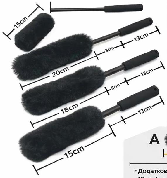 Набір йоршиків MAGNUM DBR065-SET призначений для ефективного та безпечного очищення колісних дисків від гальмівного пилу, дорожнього бруду та інших забруднень. Йоршики оснащені натуральною вовняною щетиною та ергономічною ручкою з EVA-покриттям, що забезпечує комфортну роботу без ризику пошкодження дисків. Переваги •Натуральна вовняна щетина — м’яке та делікатне очищення •Ручка з EVA-покриттям для зручного та надійного хвату •Різні розміри йоршиків для зовнішніх і внутрішніх зон диска •Підходять для алюмінієвих, лакованих та пофарбованих дисків •Оптимальні для професійного та побутового використання Характеристики •Тип: йоршики для очищення колісних дисків •Матеріал ручки: PP (поліпропілен) з EVA-покриттям •Робочий матеріал: натуральна вовняна щетина •Кількість у наборі: 4 шт. •Призначення: очищення колісних дисків, включно з важкодоступними зонами Розміри йоршиків •S — довжина ворсу 15 см, довжина ручки 13 см •M — довжина ворсу 18 см, довжина ручки 13 см •L — довжина ворсу 20 см, довжина ручки 13 см •A — довжина ворсу 15 см, довжина ручки 19,5 см •Додаткові секції ручки: 8 см / 12 см / 13 см (залежно від моделі) Комплектація •Йоршик MAGNUM S — 1 шт •Йоршик MAGNUM M — 1 шт •Йоршик MAGNUM L — 1 шт •Йоршик MAGNUM A — 1 шт Застосування Використовуються для миття та деталінгу колісних дисків, особливо у внутрішній частині та між спицями. Рекомендується застосовувати разом зі спеціальними очисниками дисків. Підсумок Набір йоршиків MAGNUM DBR065-SET — професійне рішення для ретельного та безпечного очищення колісних дисків із різною геометрією, що поєднує делікатність, ефективність і комфорт у роботі.