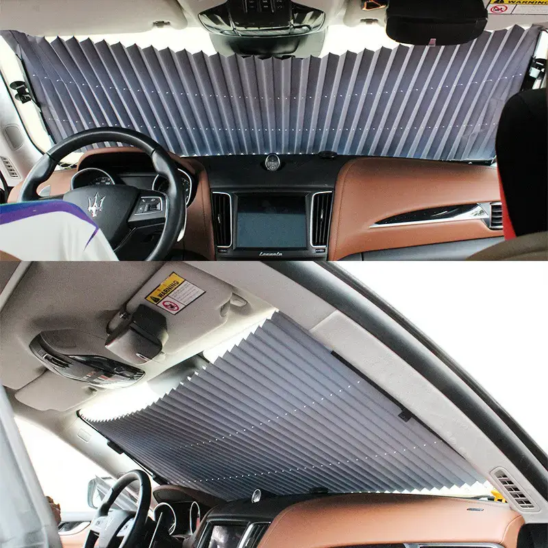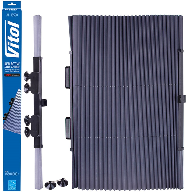 Сонцезахисна шторка Vitol AF-15565 являє собою полотно з фольгованого матеріалу з механізмом автоматичного складання за принципом віяла, за допомогою пружини і волосіні.