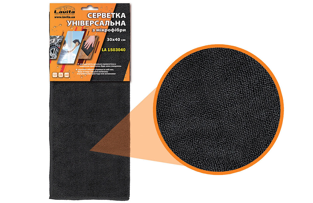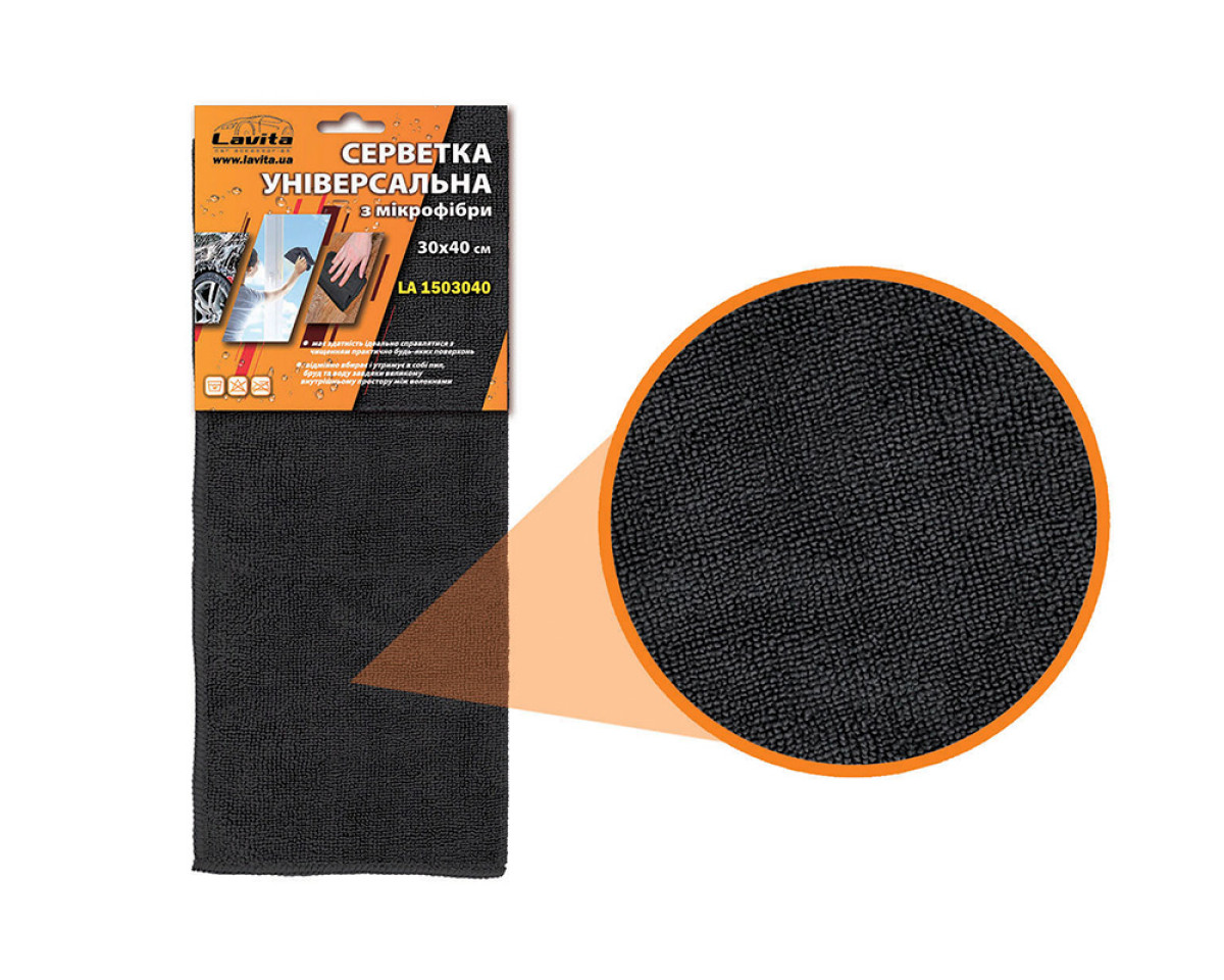 LA 1503040 Універсальна серветка з мікрофібри - це відмінний помічник в задачах догляду за інтер'єром та екстер'єром автомобіля, а також побутовою технікою, меблями, стеклами і дзеркалами. Відрізняється високими вологопоглинаючими властивостями і чудово підходить для сушки кузова і стекол автомобіля після мийки - серветка вбирає залишки води і гарантує ідеальну чистоту поверхонь без смуг, плям або розводів. Може застосовуватися для полірування кузова і нанесення воску - повністю сумісна з ними і покращує їх властивості, надає гарний глянсовий блиск покриттю і приховує його дефекти у вигляді подряпин або потертостей. Під час мийки серветка вбирає в себе абразивні частинки забруднень і мінімізує їх негативний вплив, перешкоджаючи появі подряпин. Не залишає плям, смуг або ворсинок для максимальної чистоти поверхні.