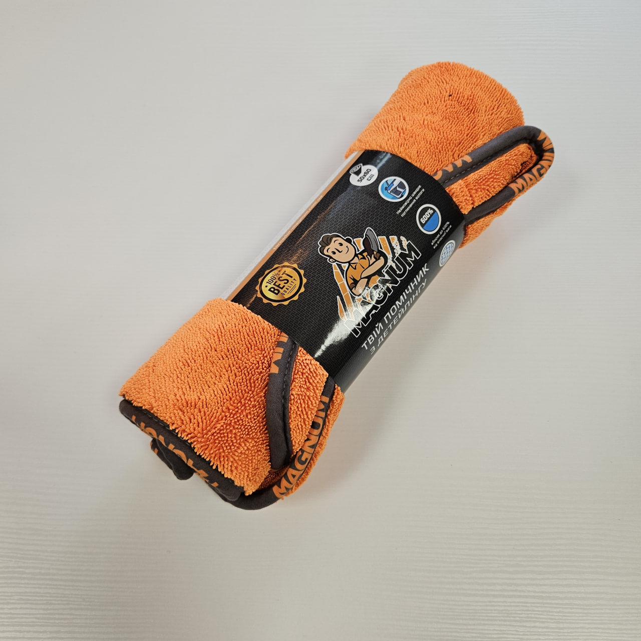 Рушник із мікрофібри MAGNUM 50×60 см — це надійний помічник для ефективного сушіння великого автомобіля після миття. Завдяки двосторонній конструкції з плетінням «скручена петля» тканина забезпечує максимальне вбирання вологи вже з першого дотику, не залишаючи розводів чи ворсу. Цей рушник ідеально підходить для сушіння кузова, скла, дзеркал та інших поверхонь, включно з лакофарбовим покриттям. Особливості: Двостороннє плетіння типу Twist Loop («скручена петля») забезпечує високу вбираючу здатність Мікрофібра щільністю 1400 г/м² швидко поглинає вологу без натискання Оптимальний розмір для роботи з різними ділянками авто Не залишає ворсинок та слідів після використання. Переваги: Велика поглинаюча здатність: дозволяє висушити автомобіль за один прохід М’якість і делікатність: не дряпає навіть чутливе лакофарбове покриття Зносостійкість: витримує багаторазове прання без втрати властивостей Універсальність: підходить як для легкових авто, так і для мікроавтобусів чи SUV Довговічність: служить роками за умови правильного догляду. Застереження: Достатньо розкласти рушник на мокрій поверхні та потягнути за краї — рушник вбирає воду без натиску Після кожного використання прати окремо від інших тканин у прохолодній воді Не використовувати кондиціонери та відбілювачі Сушити природним способом (не на батареї) Уникати прання з матеріалами, що залишають ворс Не застосовувати агресивні миючі засоби Не використовувати на гарячих поверхнях. Характеристики: Тип тканини: Мікрофібра з двостороннім скрученим плетінням Щільність: 1400 г/м² Розмір: 50×60 см Колір: Помаранчевий Призначення: Сушіння кузова та скляних поверхонь після миття Бренд: MAGNUM Країна виробництва: Китай Мікрофібра MAGNUM 50×60 см — чудовий вибір для тих, хто хоче поєднати ефективність сушіння з безпечним доглядом за великим автомобілем.
