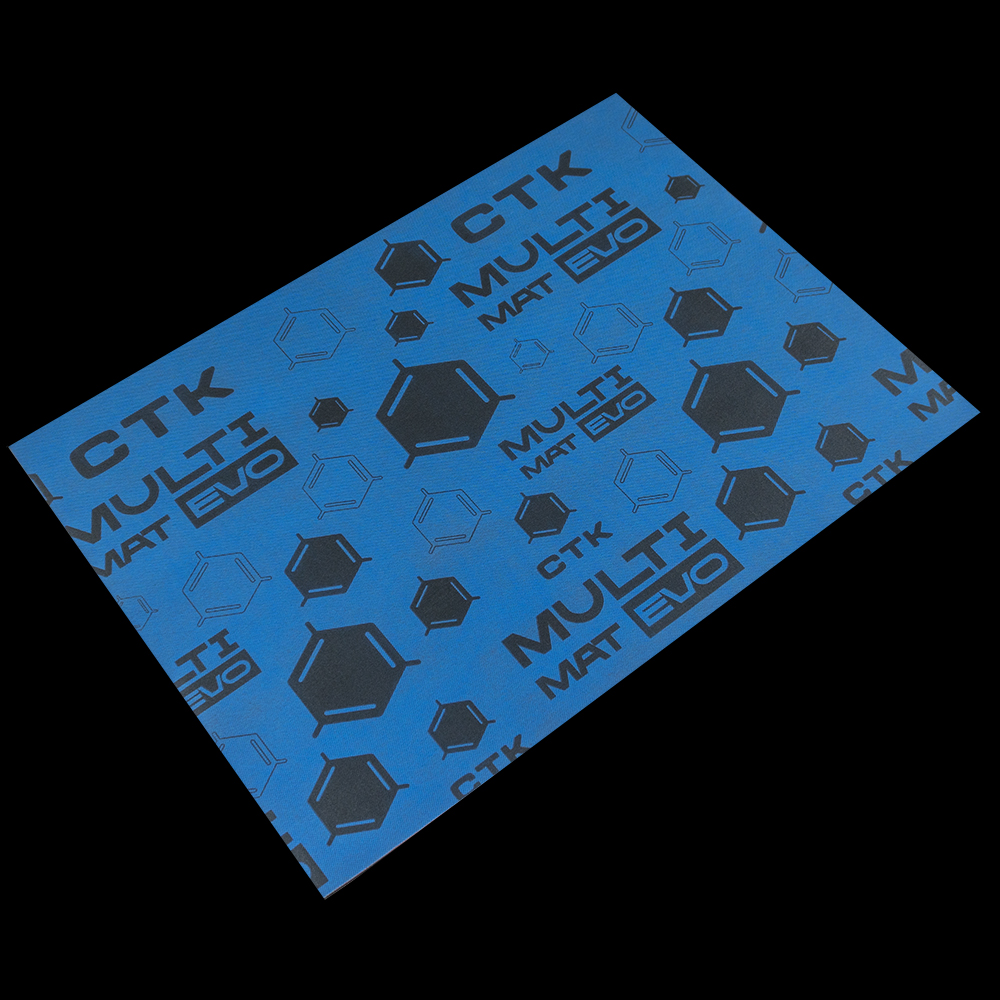 Віброізоляція СТК MULTIMAT EVO 370х500 7,5 mm. MultiMat EVO — інноваційний комбінований багатошаровий матеріал, що поєднує в собі вібро-звукоізолюючі та тепловідбивні властивості. Лист складається з акустичної мембрани з щільним шаром бутилкаучуку (2,0 мм), звукотеплоізоляційного шару на основі спіненого каучуку (4.5 мм) та полімерний клейовий шар (1.2 мм). MultiMat EVO рекомендований для нанесення 2-м шаром поверх віброізоляції у найбільш звуконавантажених місцях автомобіля. Матеріал має збільшений звукоізоляційний шар і має високий рівень звукоізоляції до 32 дБ. MultiMat EVO не боїться вологи, що дозволяє використовувати його у місцях скупчення вологи. Використання: колісні арки, дно багажника, підлога.