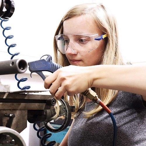 Прозорі окуляри з лінзою з полікарбонату із захистом від ультрафіолетового випромінювання належать до оптичного класу №1. Завдяки бічним вставкам окуляри добре прилягають до обличчя і максимально захищають очі від іскор, бризків, частинок, що відлітають тощо.