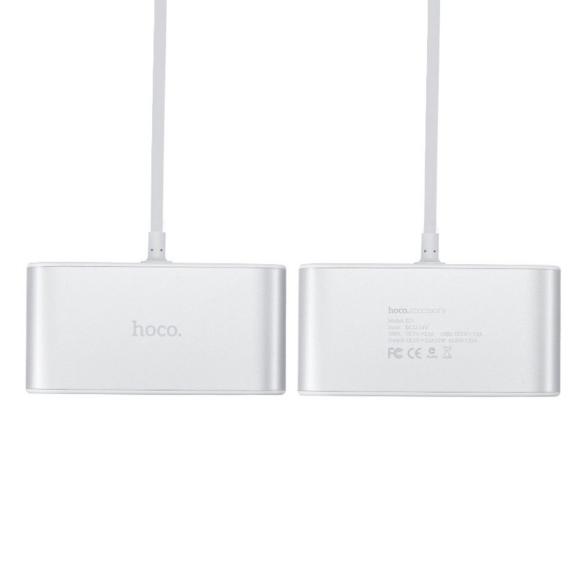 Hoco Z13 — це багатофункціональний зарядний пристрій, який є трійником із вбудованим кабелем (довжиною 55 см), двома стандартними USB-портами (2.1А МАХ) та трьома гніздами прикурювача, а також LED дисплеєм, на якому відображаються напруга акумулятора авто, вихідна та сила струму.