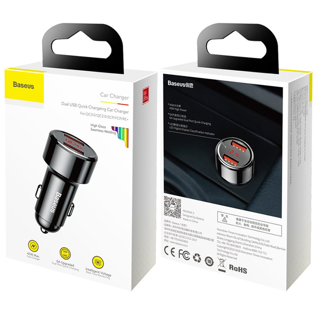 Baseus Magic Series Dual Digital Display QC 45W - це автомобільний зарядний пристрій, який працює від прикурювача. Воно відмінно взаємодіє практично з будь-якими моделями телефонів і планшетів, тому ви зможете назавжди забути про низький заряд.