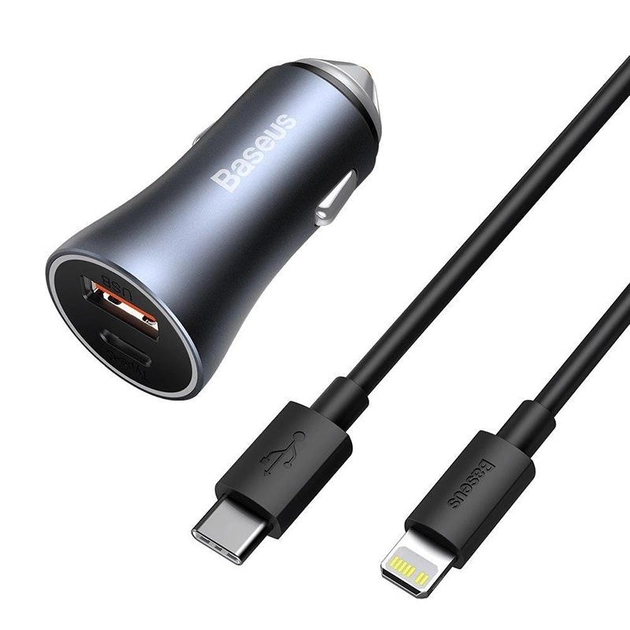 Зарядний пристрій зарядка від прикурювача Baseus 1USB + 1 USB Type-C PD 3.0А QC 40W сірий + кабель Type-C - iPhone